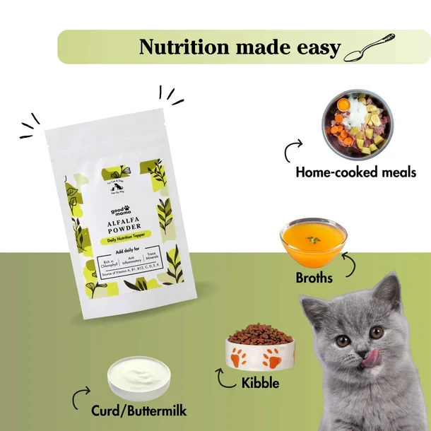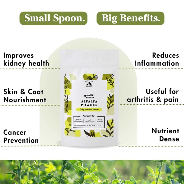 Experience the superfood magic of Alfalfa for your pet! Bursting with essential nutrients, it bridges nutritional gaps, enhancing immune strength, relieving joint pain with anti-inflammatory properties, improving digestion, skin, coat, metabolism, and weight management. It aids in cancer prevention and supports kidney/bladder health as a natural diuretic. Just 1/2 a teaspoon can transform your pet's health!
