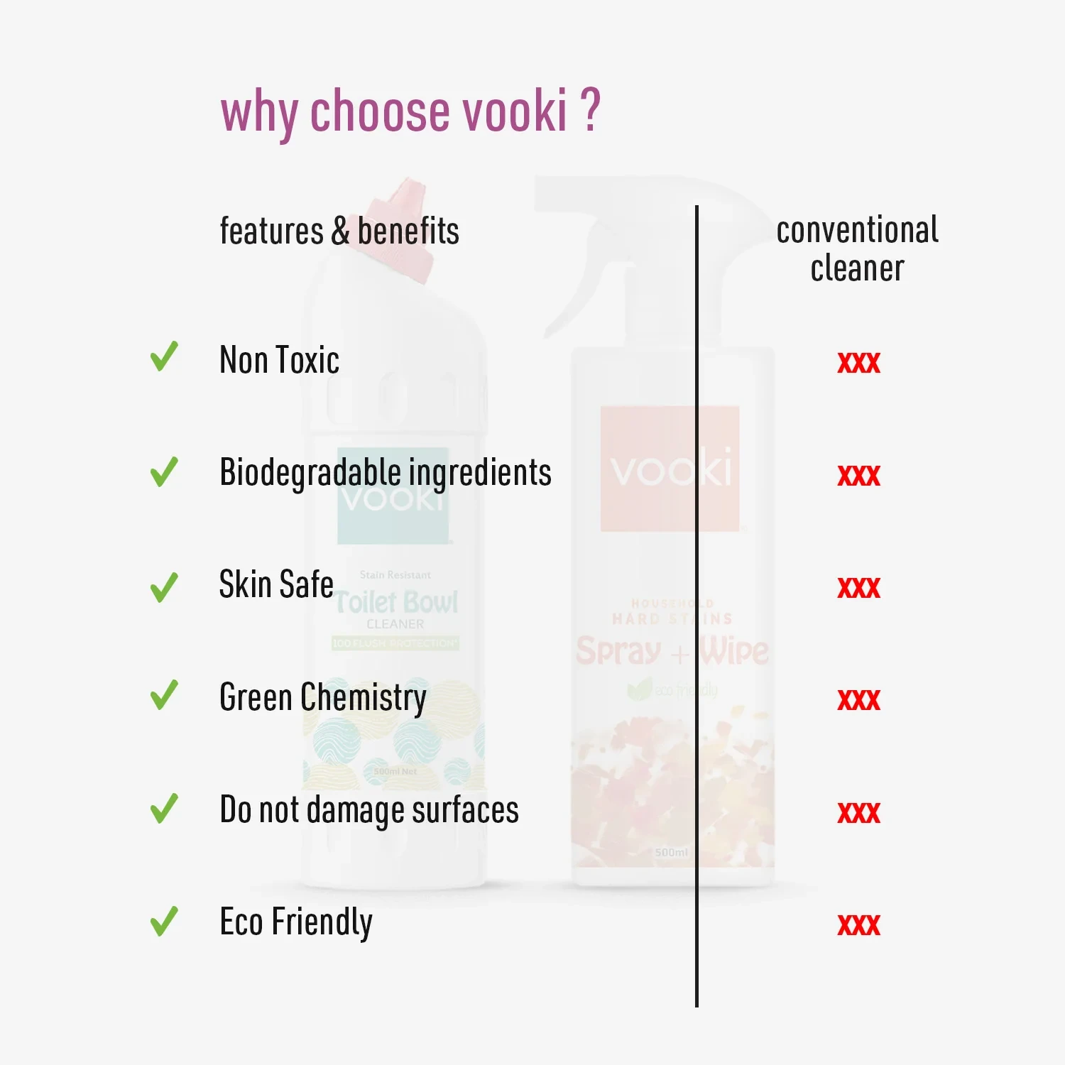 Vooki Hard Stain - Spray And Wipe made using advanced P3 formula - removes all kinds of surface stains like coffee, tea, milk, ketchup, sauce, turmeric, oil, masala, juice, vegetable marks, egg, flour stains, smoke stains, shoe marks, blood stains, rust, grease, mud, ink, crayons, lipstick marks, nail polish, poster colors, permanent marker, sketch pens, carpet stains on floor, rubber grip marks, adhesive tape marks, etc.