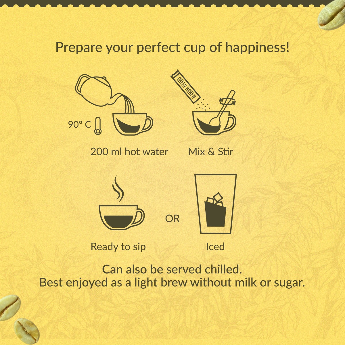 Lemon Green is a wonderful blend that combines the tangy lemon flavour and the fresh, invigorating flavour of green coffee. Drink it with hot or cold water, which makes it a flexible option for any season or preference. Enjoy the vibrant, lemony taste and fresh scent that will awaken your senses with each drink. A new take on Coffee As with the coffee bean the taste begins from the tree. The green beans we use are top quality and picked by farmers who dedicate their time to harvesting each bean, giving you a luscious flavour in each cup.