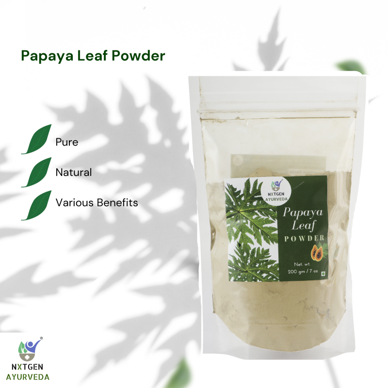 Nxtgen Ayurveda Papaya leaves powder is rich in vitamins and minerals, such as vitamins A, B1, C and E, protein, calcium, phosphorus, iron and water.It is great for the skin and hair too.Keeps dandruff away and give smooth, shiny hair.