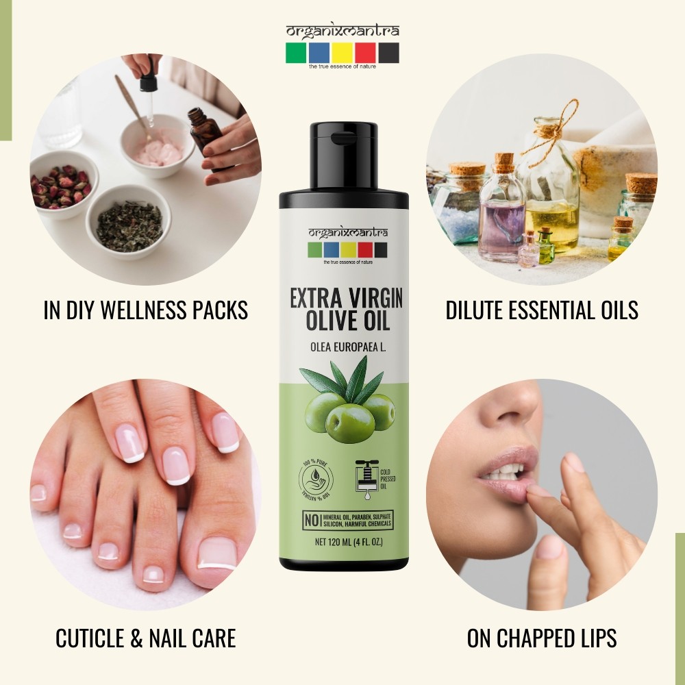 Massaging your scalp Olive Oil is known to manage dandruff, itchy and flaky scalp, and help prevent hair loss. Similarly, those with brittle nails should massage the cuticles and the nails with this Oil as it is known to soften the nails and cuticles. Extra Virgin Olive Oil can be used to dilute an Essential Oil before aroma-therapeutic massages or to create a blend with two or more Essential Oils.