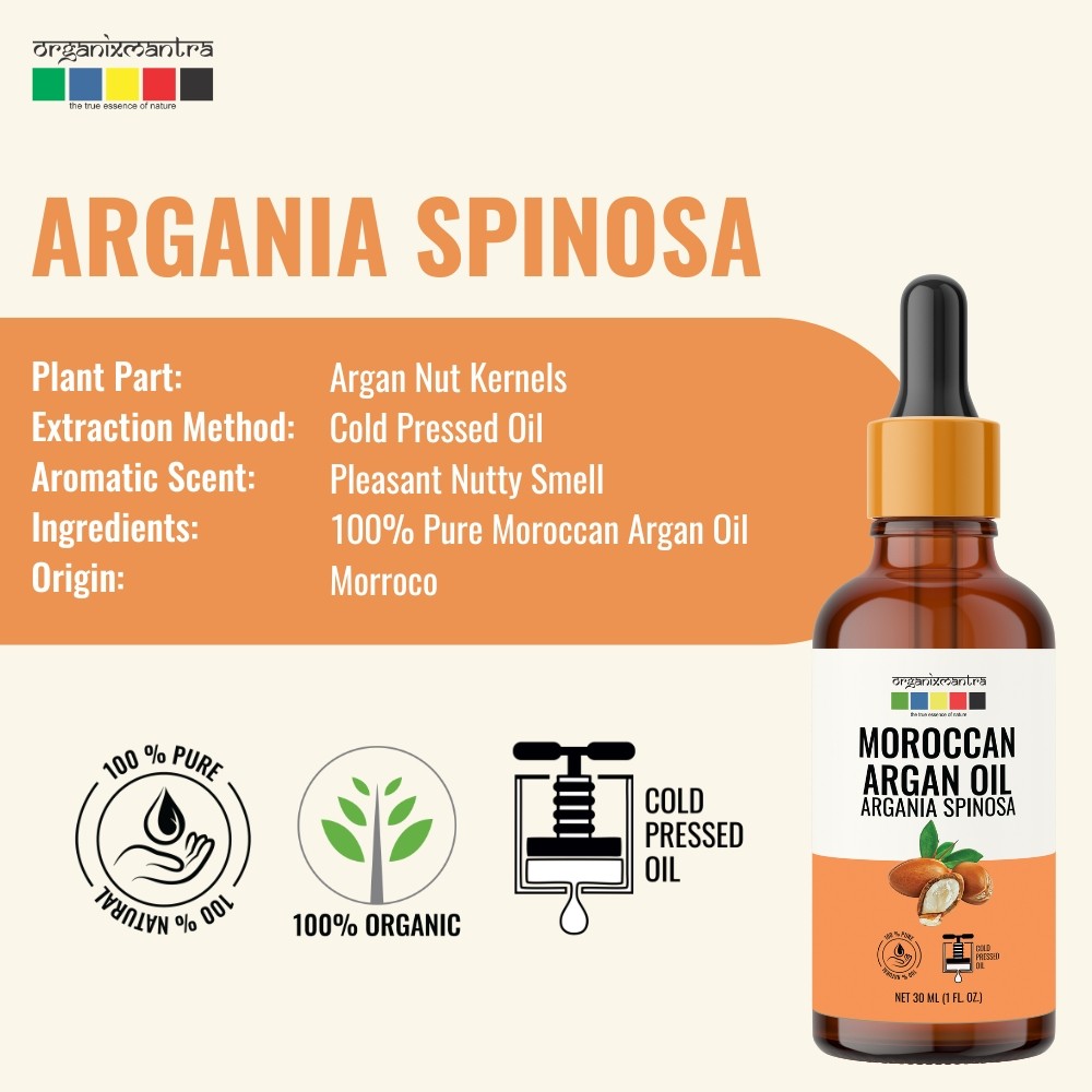 Organix Mantra Moroccan Argan Oil is 100% Pure, Cold-pressed, and Therapeutic grade Carrier Oil. It is extracted from the nuts of the Argan tree and is called Liquid Gold or Red Gold as it has the color of gold when extracted; the aroma of Argan Oil is sweet and nutty. The Oil has a myriad of benefits for skin and hair care as it is naturally rich in essential fatty acids, antioxidants, and Vitamin E. These are the nourishing nutrients that are much needed for both the skin as well as hair. Massaging your face with this Carrier Oil regularly is known to reduce dark spots, blemishes, acne spots, and acne breakouts while delaying the formation of wrinkles and fine lines.