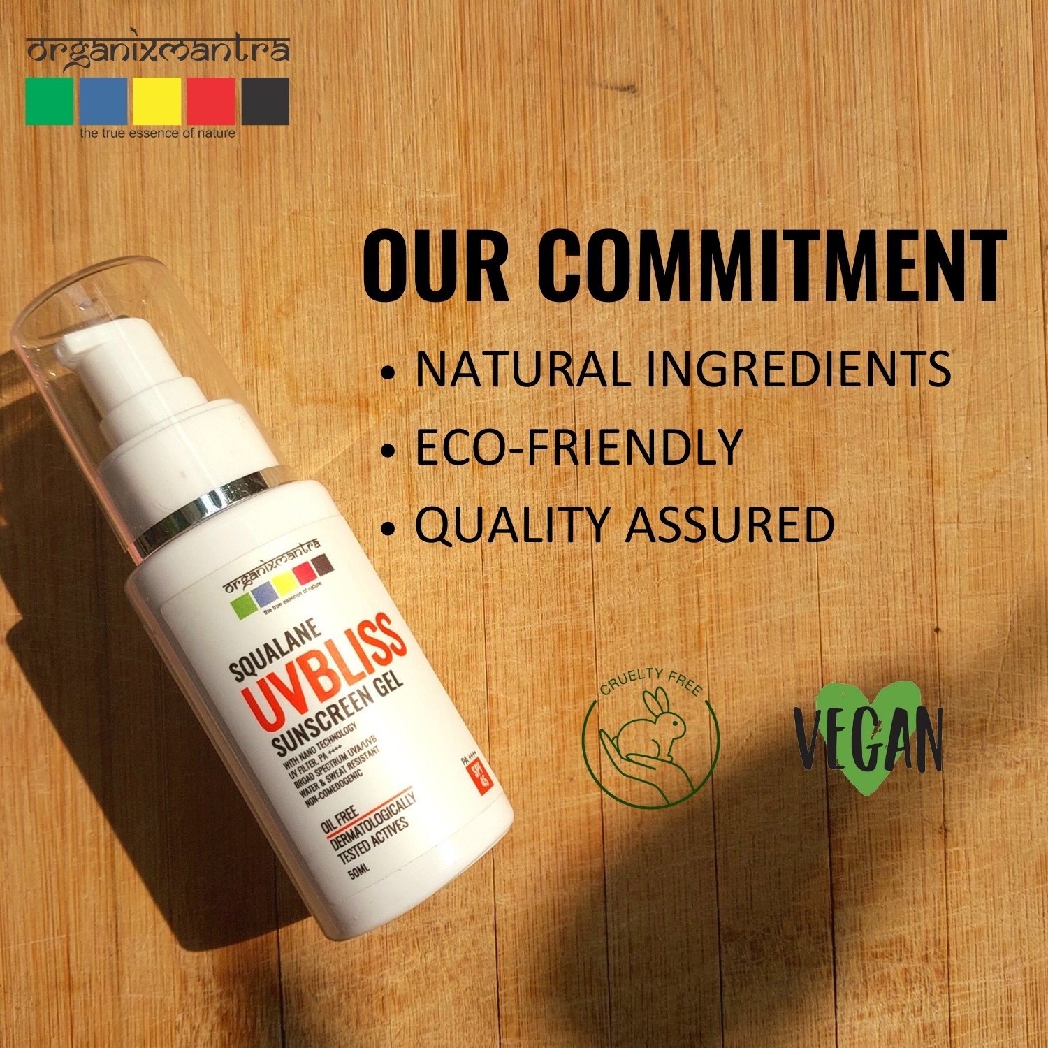 Squalane UV Bliss Sunscreen Gel offers a master blend of nature’s finest for skin protection and nourishment. Squalane, our star ingredient, is known to naturally shield against UV rays while hydrating the skin. Rose Water and Aloe Vera Gel have properties to soothe and refresh, ensuring your skin feels revitalized. Bamboo and Purslane Extracts are known to refine skin texture, while Shiitake Mushroom gives an anti-aging lift.
