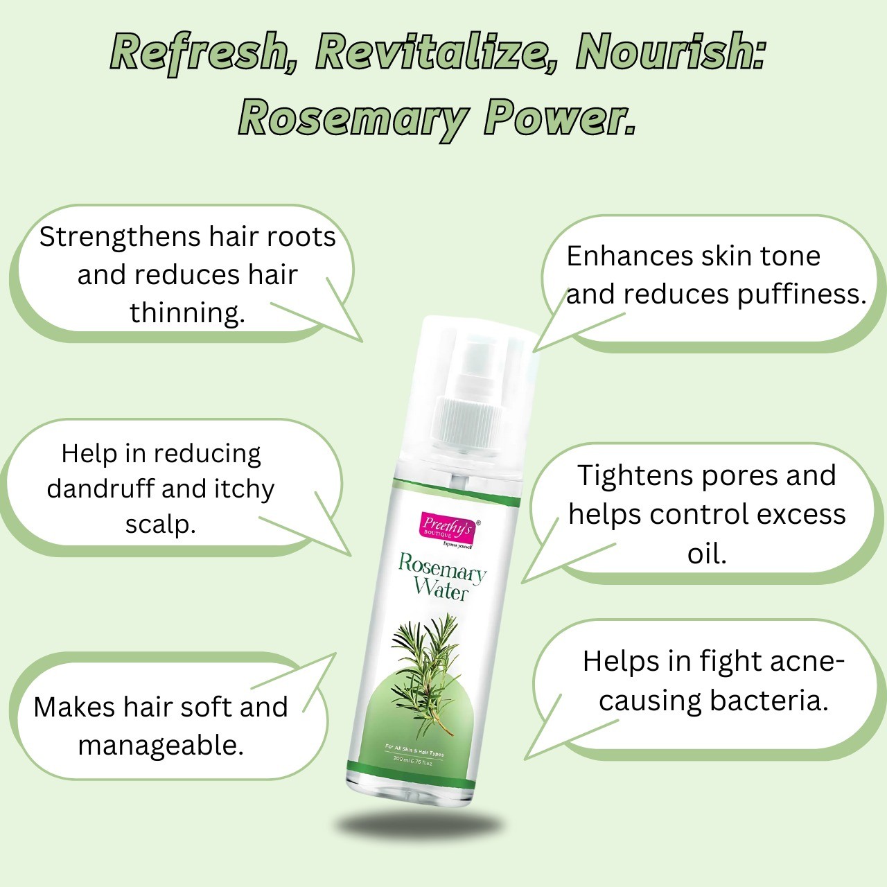 Unlock the natural power of rosemary with our 100% pure Rosemary Leaves Water. Extracted from fresh rosemary leaves. A convenient, ready-to-use spray simplifies your routine, saving you time and effort every day.