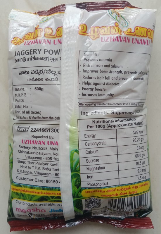 Uzhavan Unavu - Chemical free organic nattu sakkarai / Country sugar / Brown sugar - 500 Gm