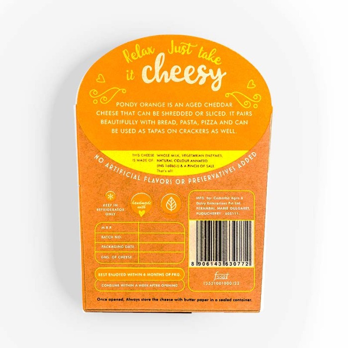 Pondy Orange Cheese offers a bold and tangy taste in every bite, developed through a carefully controlled aging process. Naturally cultured for depth, it delivers a sharp, rich flavour that stands out, while its bright orange colour adds visual appeal to any cheese spread. Handcrafted with care, this cheddar brings character and intensity to both simple and gourmet dishes.