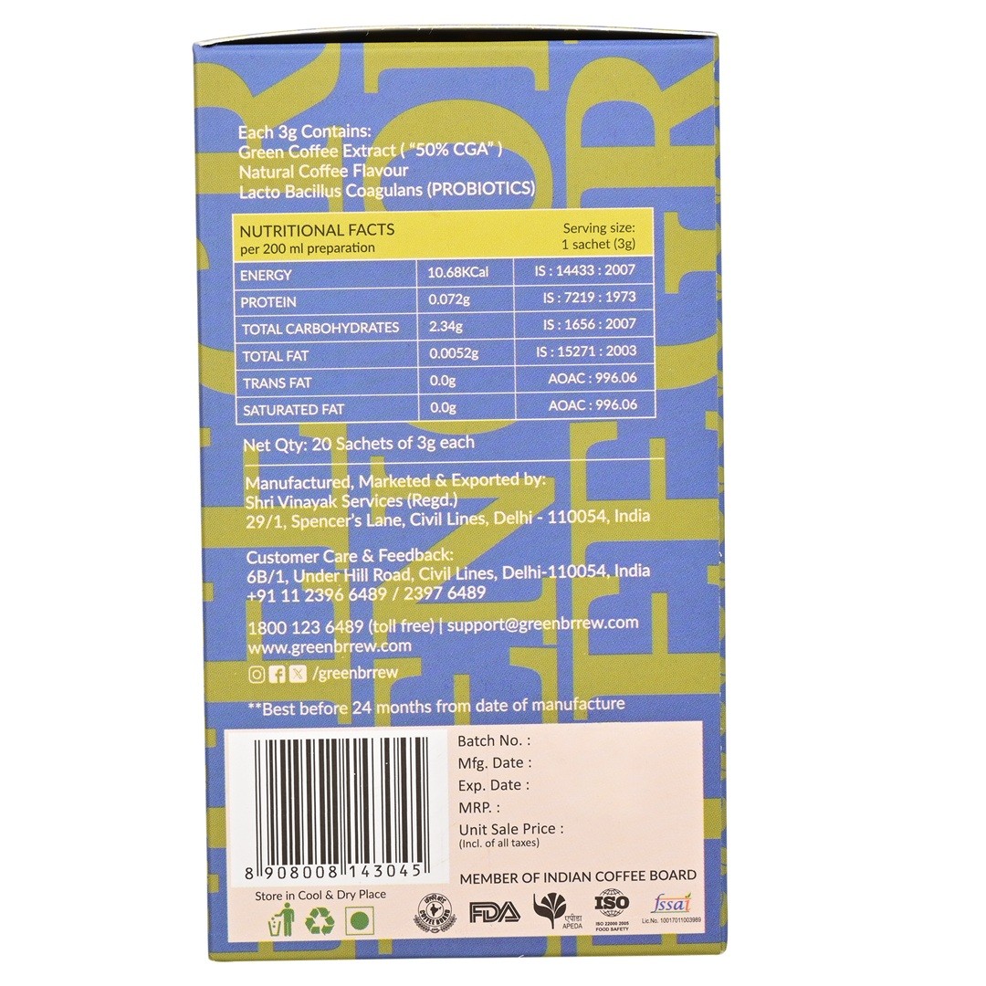 Ingredients: Green Coffee Extract ('50% CGA"), Natural Coffee Flavour, Lacto Bacillus Coagulans (Probiotics)